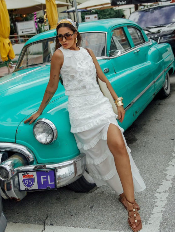 Saia midi bordada com fenda