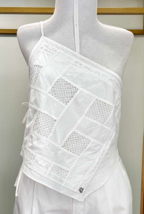 Top Regata nula manda com detalhe de renda e corte assimétricO.